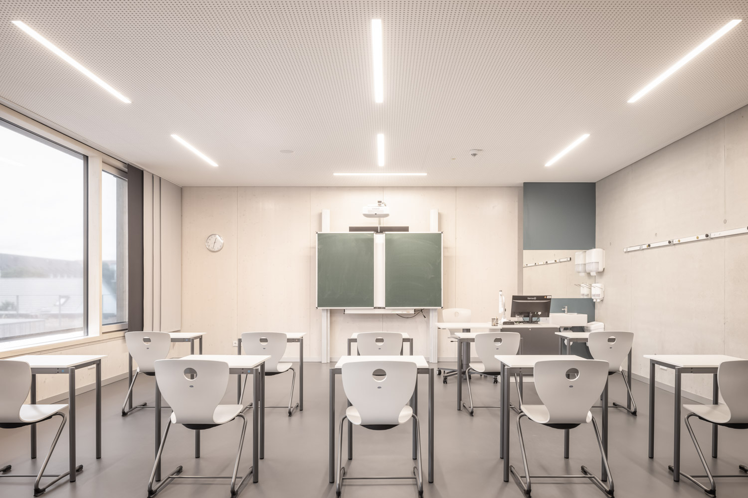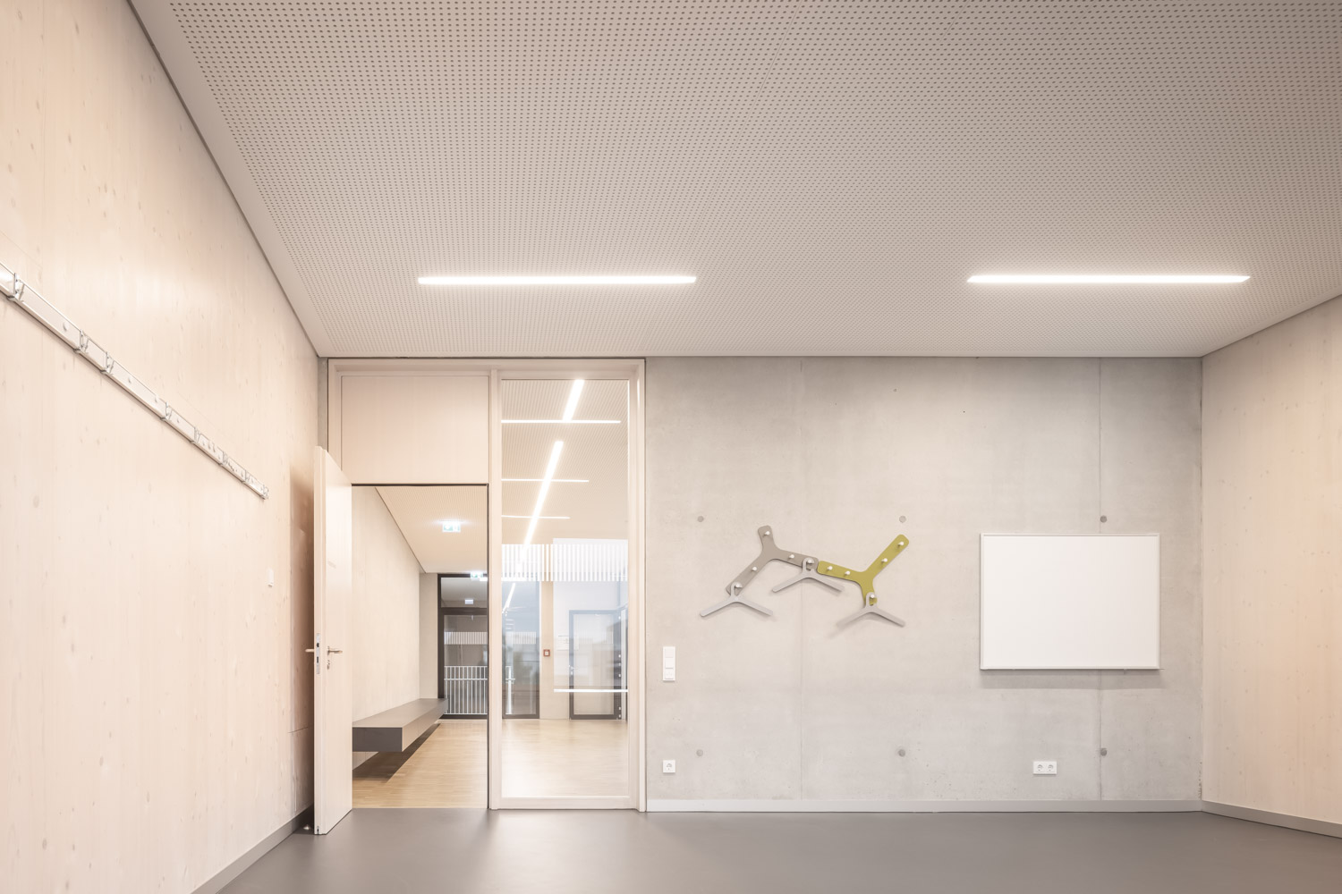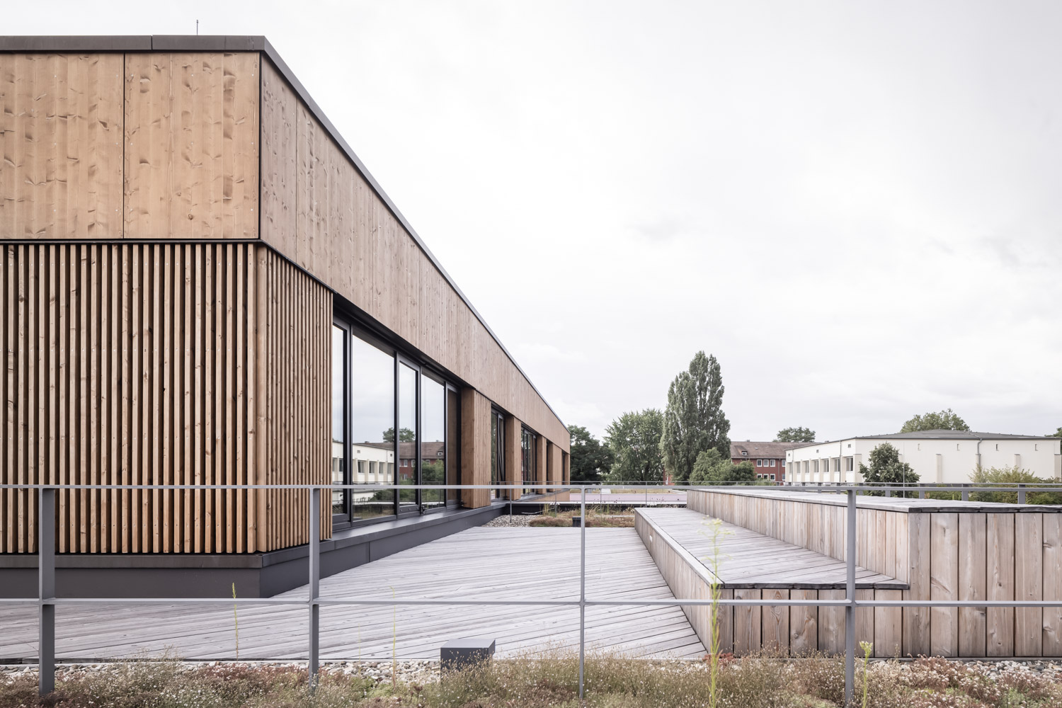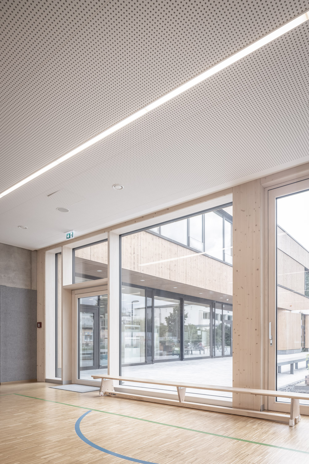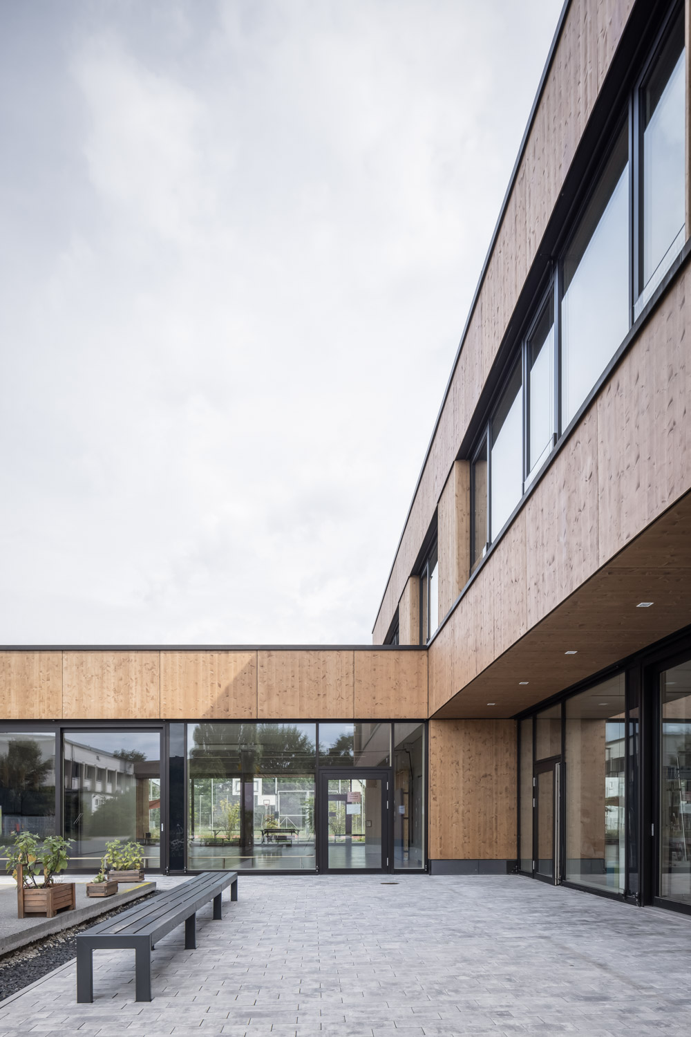 Das Gebäude wurde als Atriumtyp entwickelt. Der Eingang erfolgt über einen Windfang von Westen. Bibliothek, Pausenhalle und Musiksaal bilden ein zusammenhängendes Raumgefüge, welches auch als Aula genutzt werden kann. Die Pausenhalle wird begrenzt durch den über beide Geschosse vorhandenen Block mit Aufzug, WC’s und weiteren Nebenräumen. Nördlich ist der musische Bereich verortet. Zeichensaal und Werkraum öffnen sich zu einem vorgelagerten Terrassenbereich. Der Mehrzweckraum und der Raum für Bewegungstherapie können über eine mobile Trennwand zu einem Raum zusammen geschaltet werden. Südlich der Pausenhalle befindet sich die Raumspange der Verwaltung mit Lehrerzimmer und Büros. Die Klassenräume und Gruppenräume im 1. Obergeschoss gruppieren sich einhüftig um den Luftraum des 2-geschossigen Atriums. Die zentrale vertikale Erschließung erfolgt über eine großzügige, gewendelte Treppe. Das Gebäude wurde in Hybridbauweise aus Stahlbeton und Massivholzelementen (BBS-Brettsperrholz) geplant. Dabei wurden statisch tragende Elemente sowie Bauteile mit höheren Brand- und Schallschutzanforderungen in Stahlbeton und Außenwand-, Trennwand- und Dachbauteile in Holz geplant. Holz findet sich auch im Bereich der Fassade wieder. Diese wird durch horizontale Plattenverkleidungen und fensterhohe Lamellenverkleidungen strukturiert. Die Fensterelemente der Klassenräume wurden mit abgesenkter Brüstung (BRH 70cm) in Holz-Aluminium Pfosten-Riegel-Konstruktion ausgeführt. Die Räume des Erdgeschosses erhielten raumhohe Verglasungen. Die Größe der Fassadenelemente richtete sich nach der Nutzung und des gewünschten Transparenzgrades der dahinter liegenden Raumnutzung. Die Eingangsfassade mit Windfang und benachbarter Bibliothek wurde transparent gehalten, um bereits vom Vorplatz Einblicke in das Schulgebäude zu gestatten.