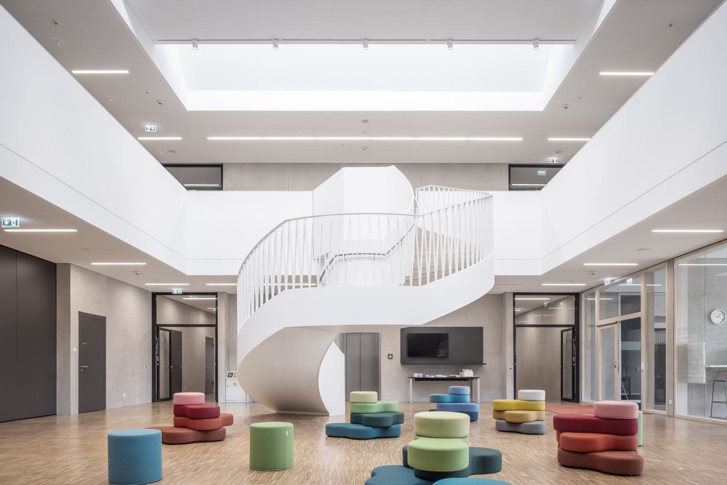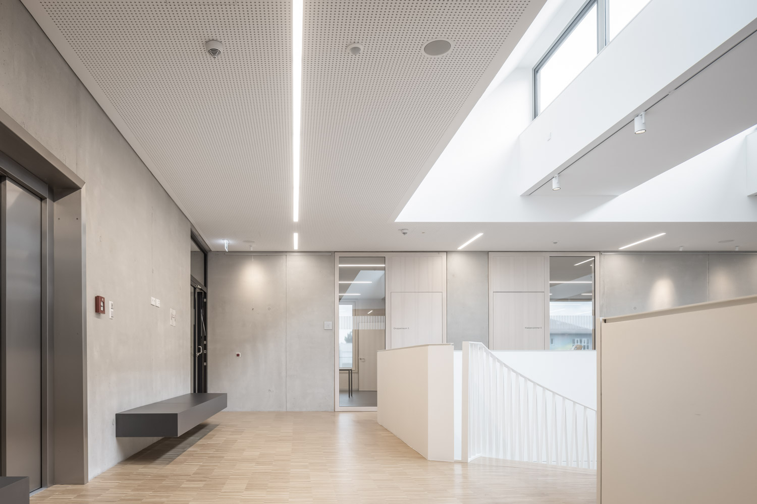 beträgt etwa 2.908 m². Auf dem Gesamtareal befinden sich weitere schulische Nutzungen, die städtische Real- und Wirtschaftsschule- Hans-Böckler Schule, die Grundschule John-F.-Kennedy Straße sowie eine Einrichtung des Stadtjugendrings. Das Raumprogramm gliedert sich in den allgemeinen Unterrichtsbereich mit 7 Klassenräumen, 4 Gruppenräumen, die als Differenzierungsräume dienen, einen Mehrzweckraum, einen Computer- und Datenverarbeitungsraum sowie Räume für Sammlung und Lehrmittel, in den musischen Bereich mit Räumen für Musikerziehung, Bewegungserziehung, Zeichensaal, Werkraum, Nassraum und zugehörige Nebenräume, den Bereich Bibliothek und Räume für Lehrer, den Bereich Verwaltung sowie Pausenflächen und Nebenräume für Lager und Hausmeister.